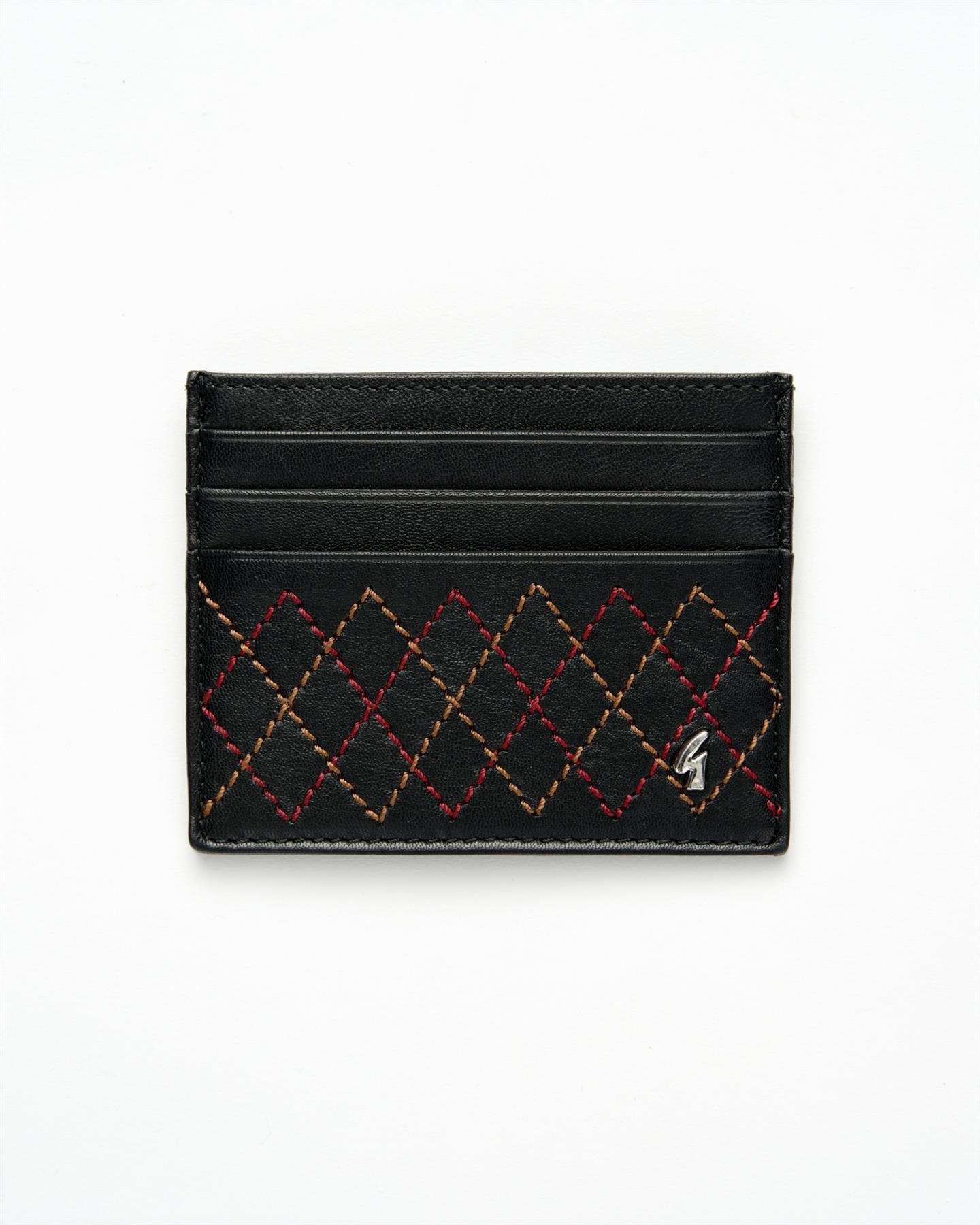 A slim leather card holder with neat cross-stitch detail. Simple, practical, and easy to carry.