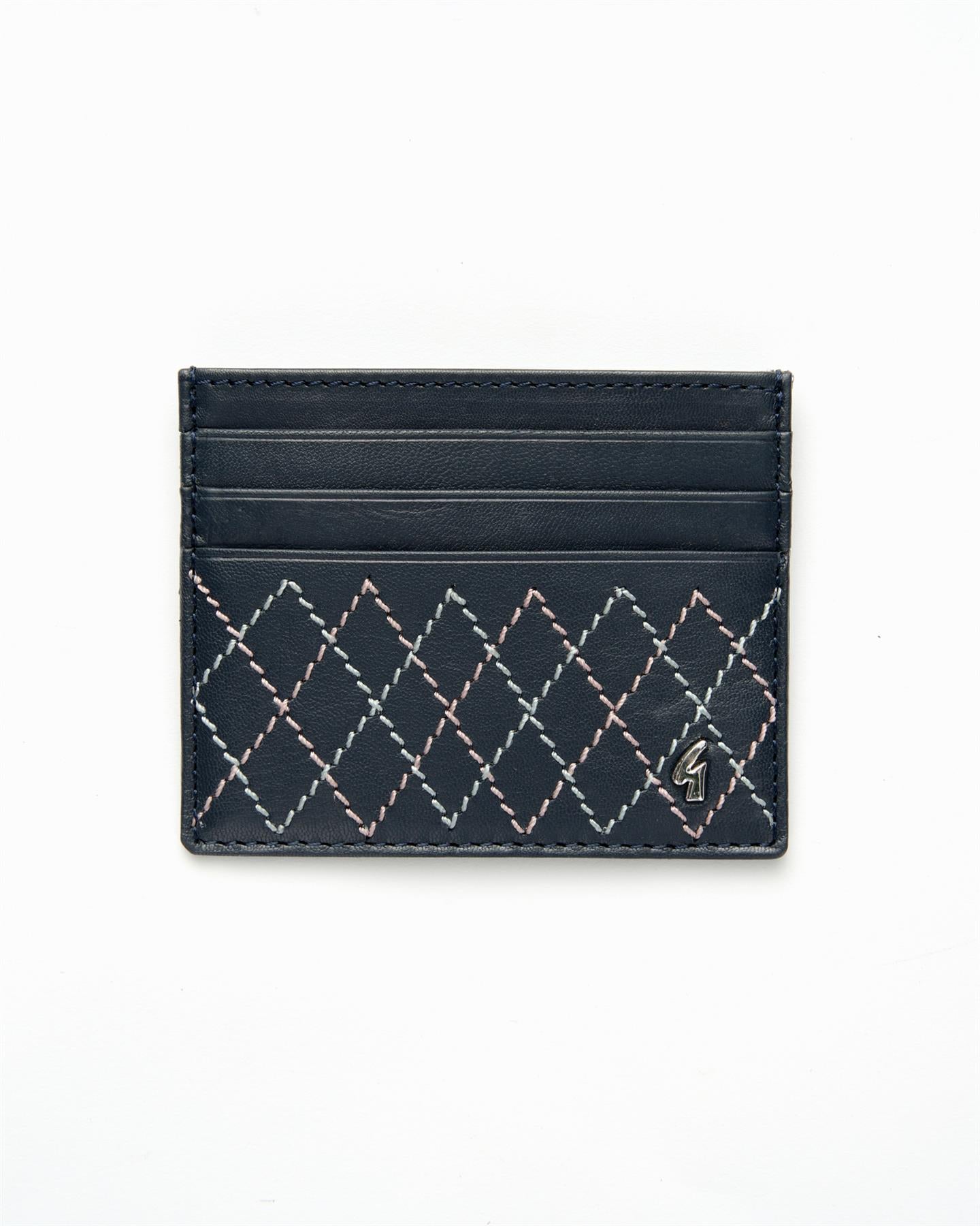 A slim leather card holder with neat cross-stitch detail. Simple, practical, and easy to carry.