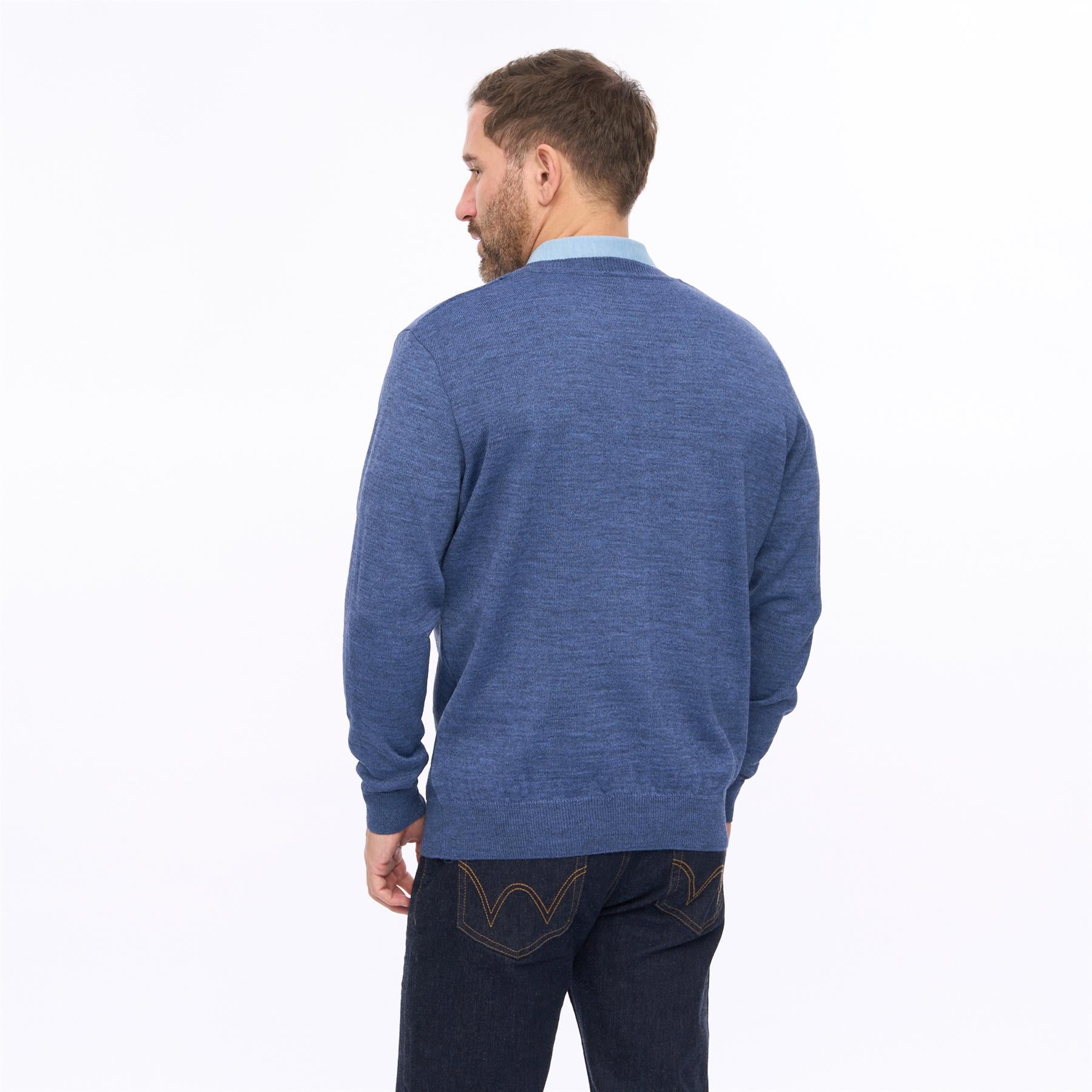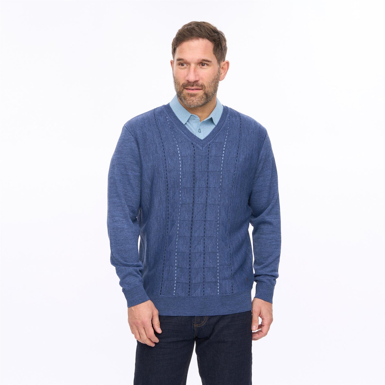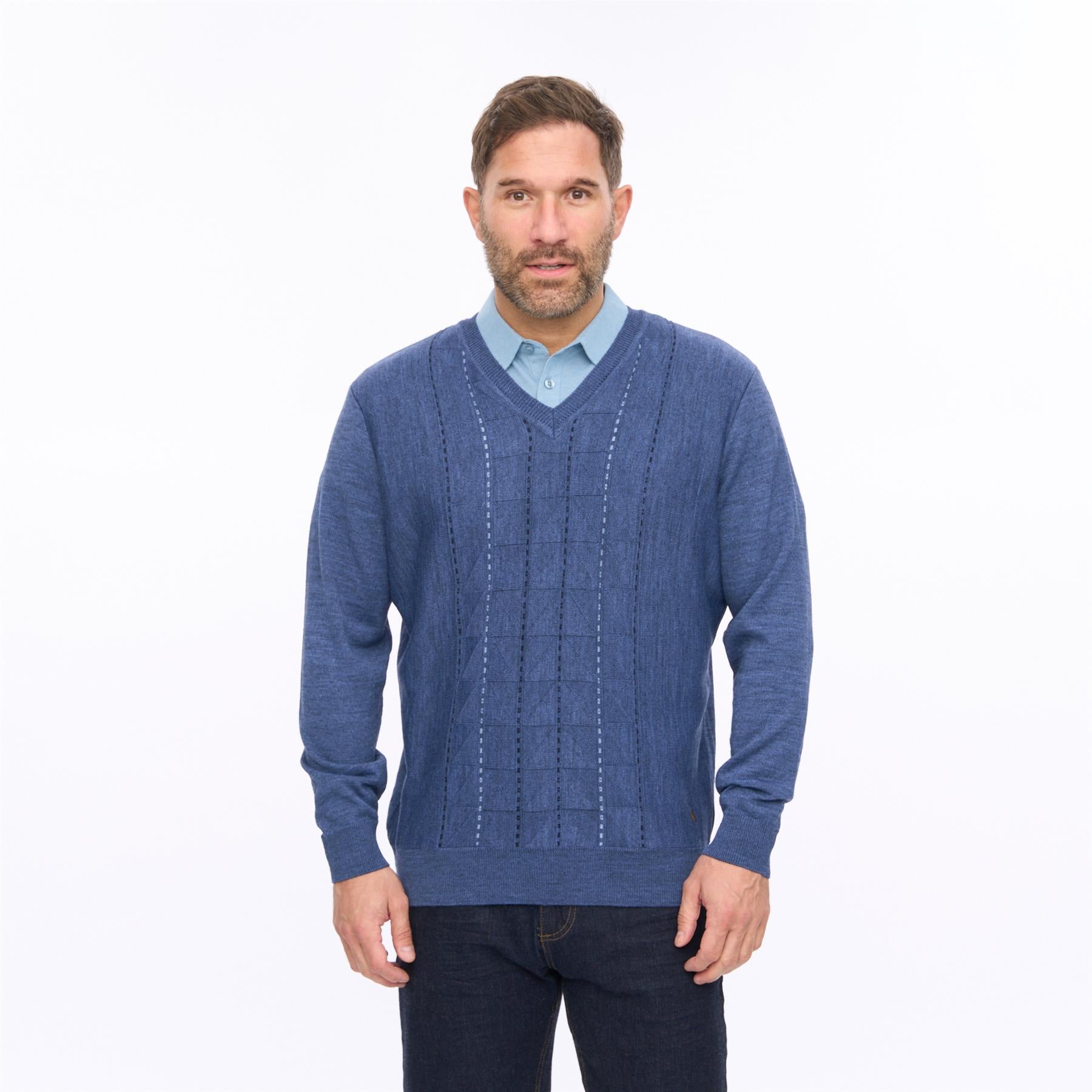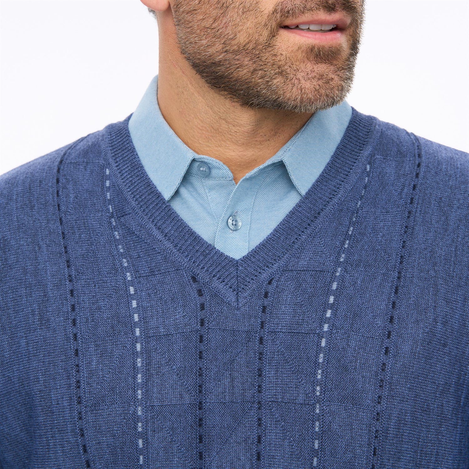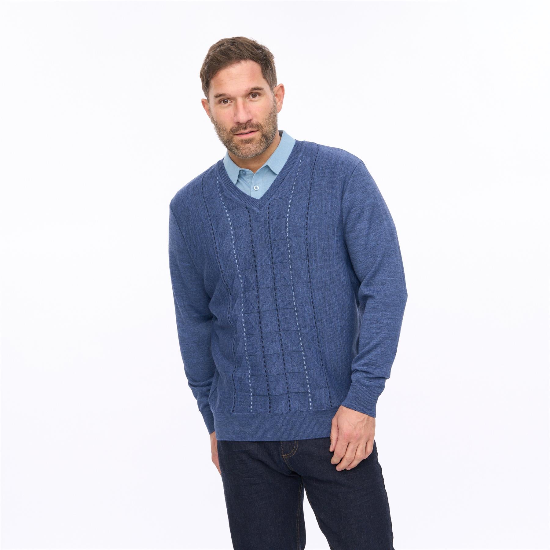 Crafted for comfort and versatility, it features a classic V-neckline that layers perfectly over shirts or polos, while the ribbed cuffs and hem provide a neat, structured finish. The patterned knit front adds depth and character, making it a standout yet easy-to-wear piece for both casual and smarter occasions.