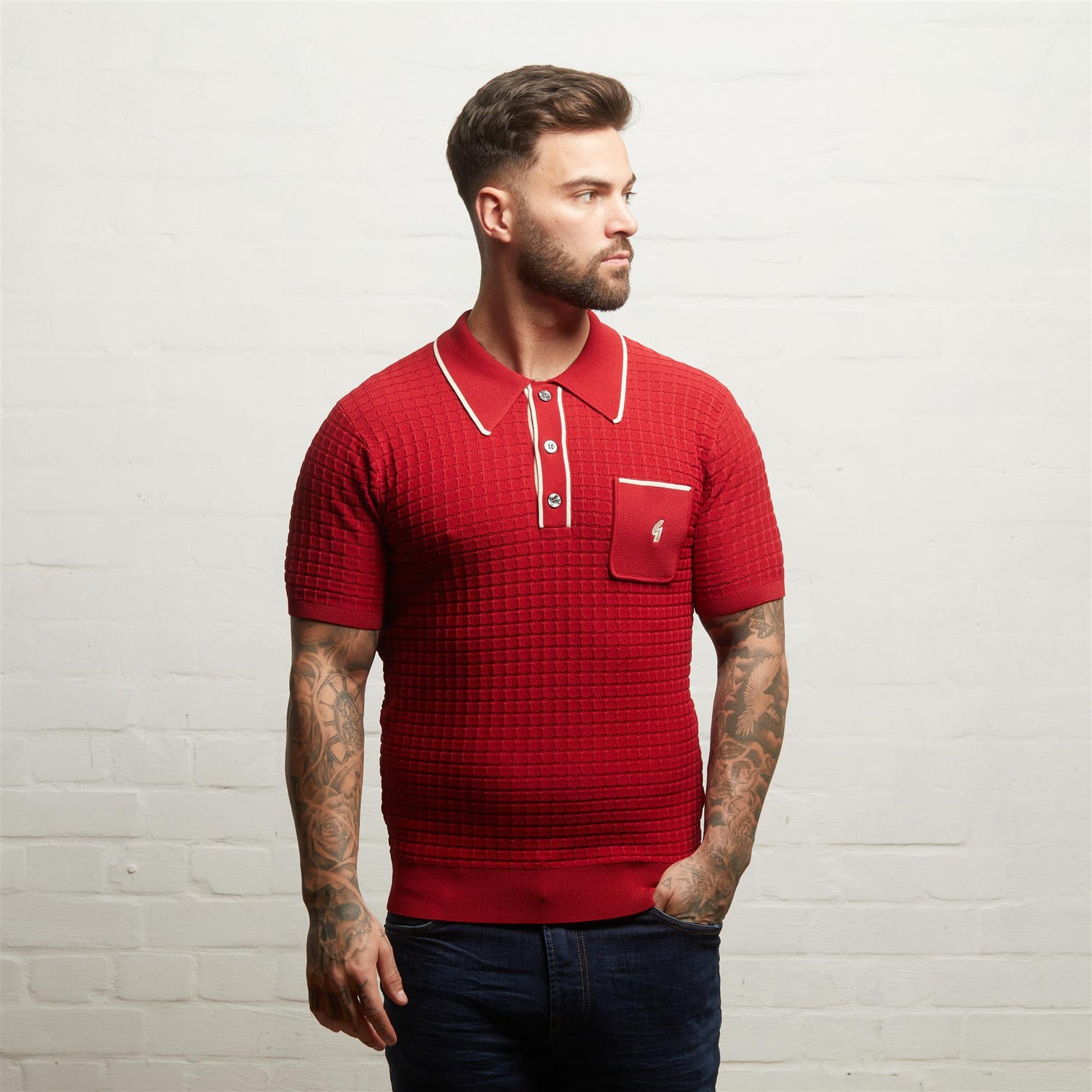 Presenting Mens Roy Short Sleeve Archive Knitted Three Button Polo Gabicci Vintage Cherry